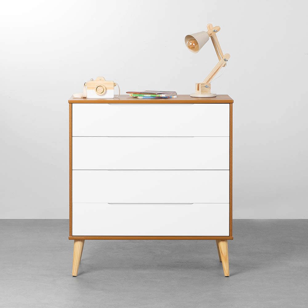 Cômoda Elfe 4 Gavetas com Pés Retrô Natural - Branco Fosco e Savana