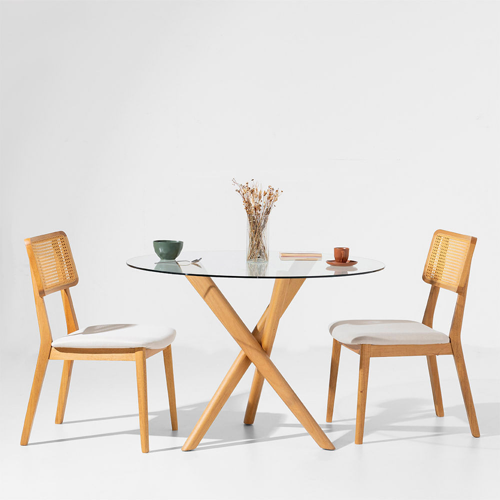 Conjunto Mesa de Jantar Thai Redonda Vidro Incolor - 1,10m + 2 Cadeiras Lalá Encosto Palha Creme Assento Plot Cru