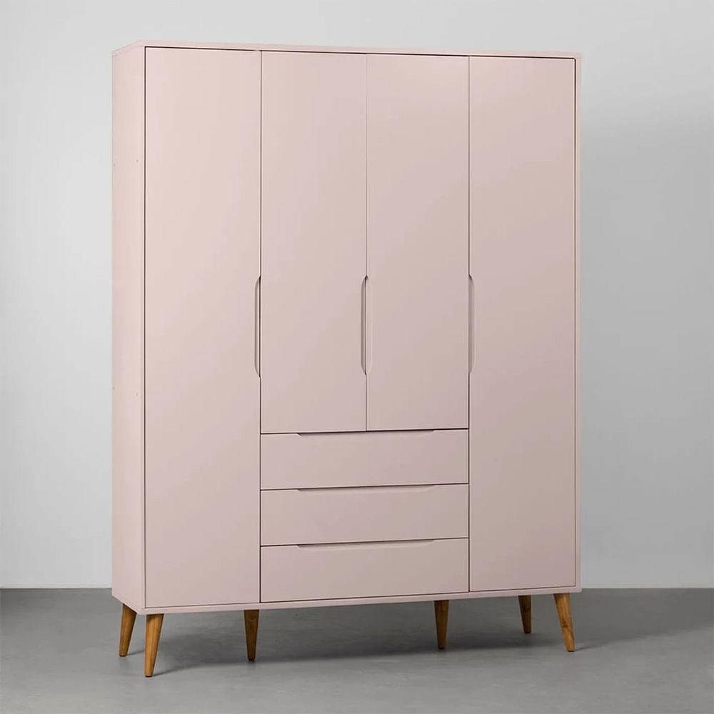 Guarda-Roupa Elfe 4 Portas e 3 Gavetas com Pés Retrô Mel - Rosa Fosco