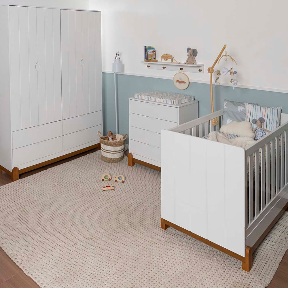 Kit Quarto Infantil Theo com Pés Retrô Natural - Berço + Cômoda 6 Gavetas + Guarda-Roupa 3 Portas - Branco Fosco