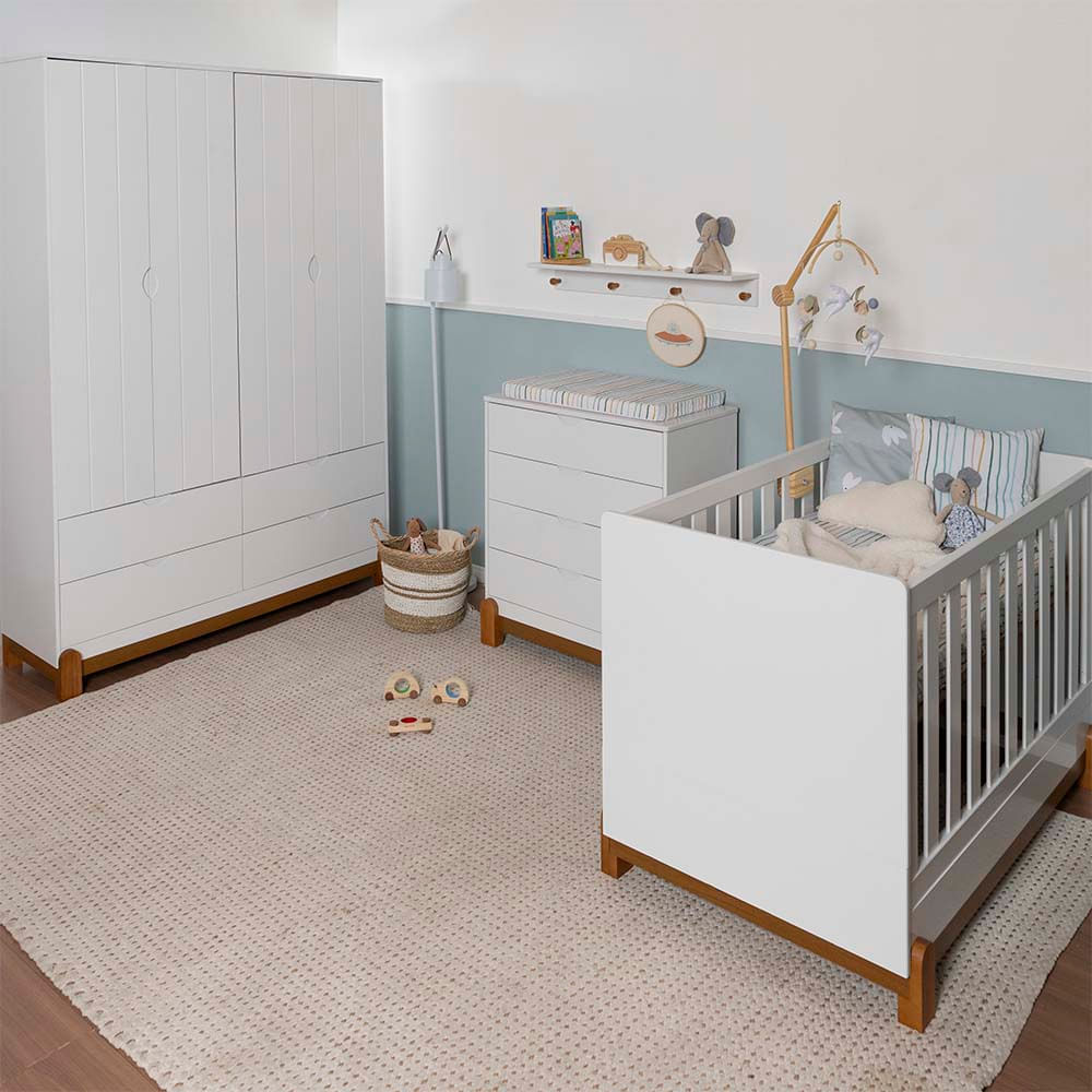 Kit Quarto Infantil Lotus Berço Mini Cama + Cômoda 4 Gavetas + Guarda-Roupa 4 Portas com 4 Gavetas - Branco Fosco